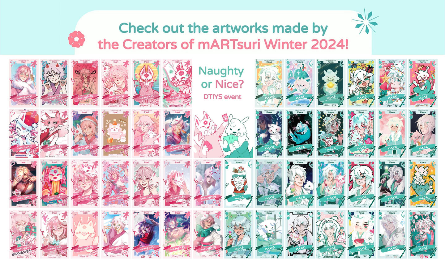 Imagine a mix between 'OC Trading Cards' and 'Artfight' tied in with our Winter event theme. There are two teams based on our mascots, Team Inari🦊(Naughty!) and Team Kawa🦦(Nice!).Tis the season of sharing - and trading cards!